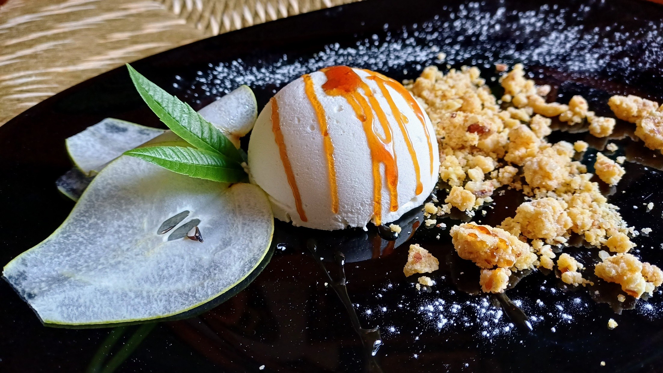 alla pera, crumble di sbrisolona e sciroppo di taràssaco