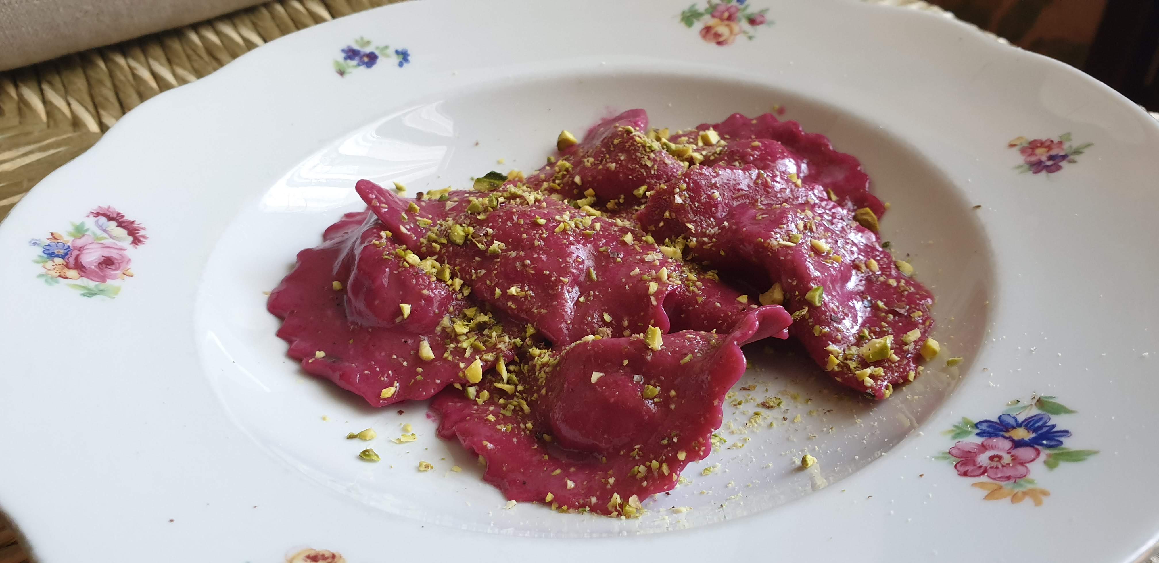 Tortelli di ciliegie, burro fuso, grana e pistacchi