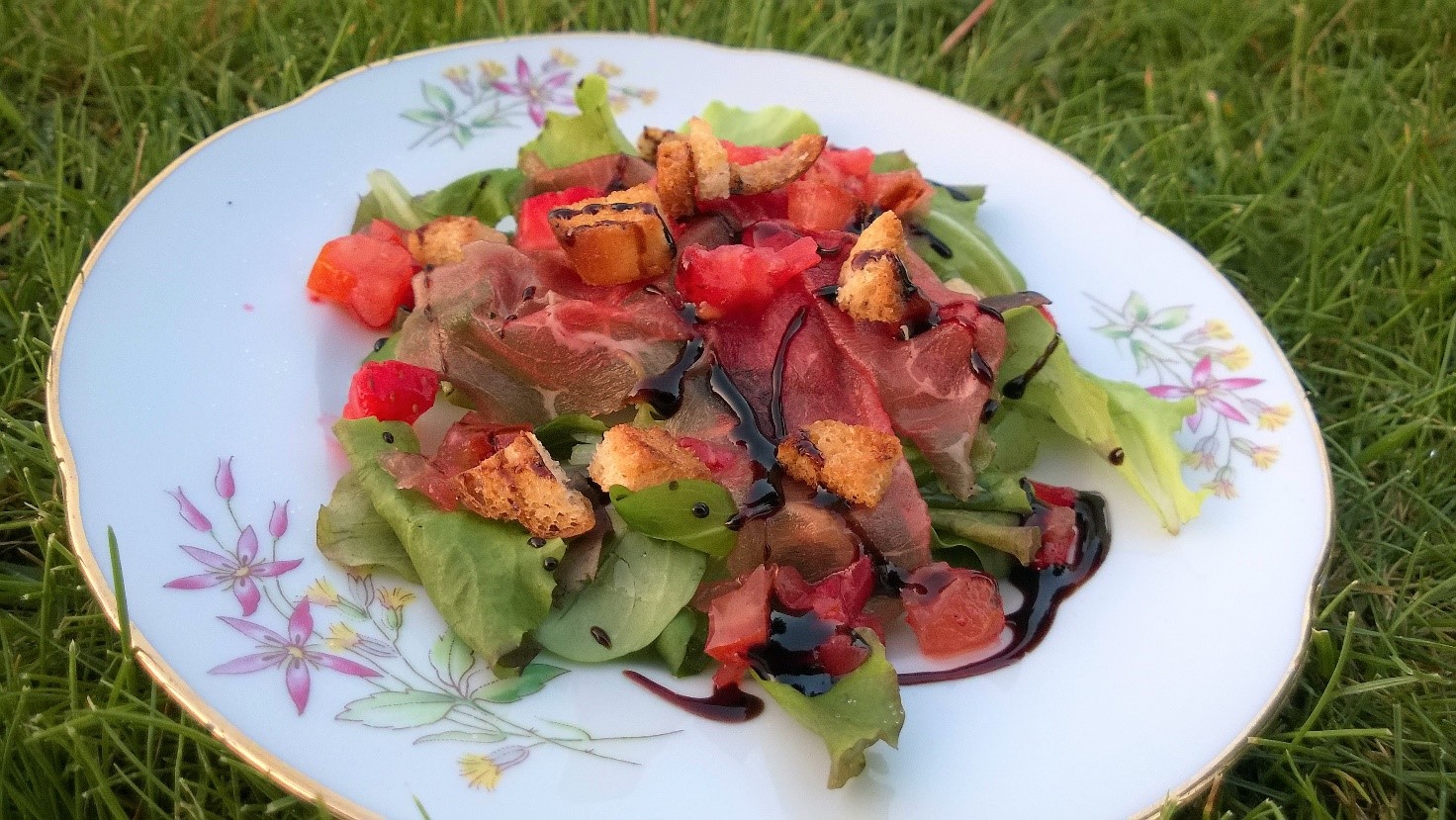 Insalata misticanza con carne salata di manzo, tartare di fragole e aceto balsamico
